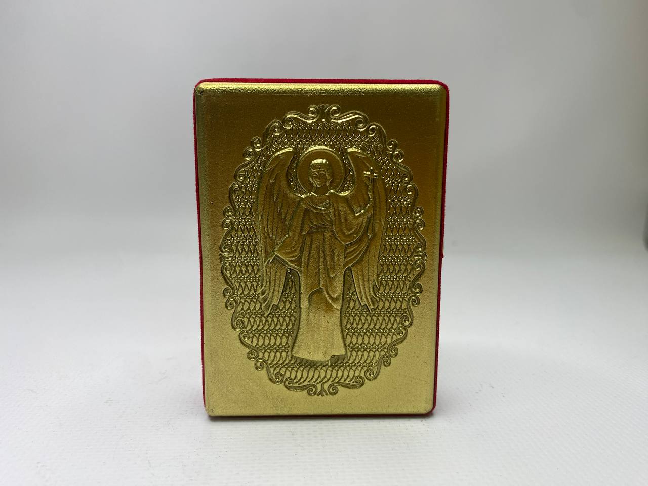 Икона выполнена из дерева с отделкой из бумаги и мягкого бархата. Красный бархат придаёт иконе торжественный и благородный вид. Надёжная защёлка сбоку защищает икону от случайного раскрытия.