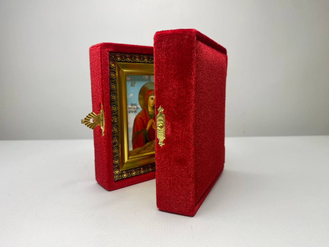 Складень изготовлен из дерева и покрыт мягким красным бархатом, приятным на ощупь. Изображения икон выполнены на высококачественной бумаге с тиснением и оформлены в багет с золочением, что добавляет изделию особую утончённость и подчеркивает ценность образов. Иконы можно извлекать из багета, что открывает дополнительные возможности для ухода и размещения.